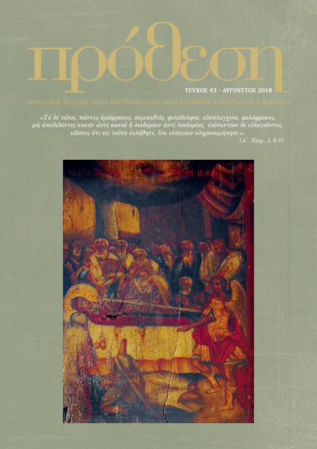 της Κρήτης Τρίτη 24 Ιουλίου 2018 Ἡ Ἱερά Ἐπαρχιακή Σύνοδος τῆς Ἐκκλησίας Κρήτης μέ βαθειά ὀδύνη συμμετέχει στό βαθύτατο πόνο, τόν ὁποῖο βιώνουμε ὡς Ἔθνος, μέ τήν τραγωδία ἡ ὁποία ἀπό χθές συντελεῖται στήν Ἀττική, μέ τίς καταστροφικές πυρκαγιές καί τά τραγικά ἀποτελέσματά τους, κυρίως δέ γιά τά ἀνθρώπινα θύματα, τά ὁποῖα θρηνοῦμε.Ἡ Ἐκκλησία τῆς Κρήτης δηλώνει τήν ἀμέριστη συμπράστασή Της στούς πληγέντες καί ἐντείνει τίς προσευχές Της στόν Θεό, γιά τήν ἀνάπαυση τῶν μαρτυρικῶς τελειωθέντων καί τήν ἐνίσχυση τῶν τραυματιῶν, τῶν ἐμπεριστάτων καί ἐν γένει ὅλων τῶν θυμάτων τῆς πύρινης λαίλαπας.....Περισσότερα |