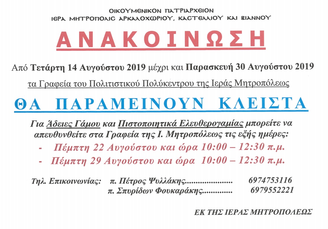 Ανακοίνωση Ιεράς Μητροπόλεως για τη λειτουργία των γραφείων της από 14 έως 30 Αυγούστου 2019