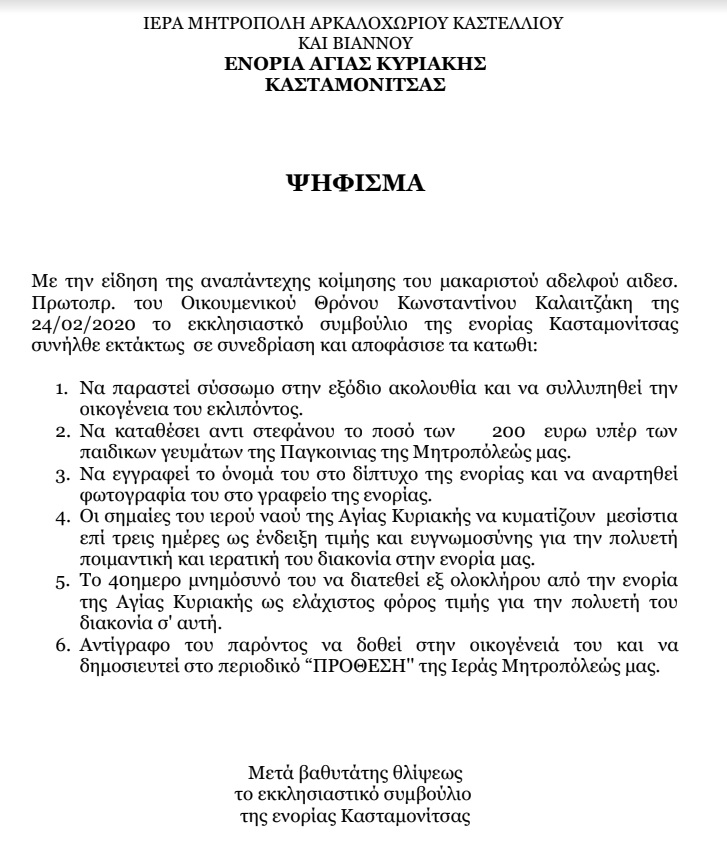 Ακολουθεί το ψήφισμα της Ενορίας Κασταμονίτσας: