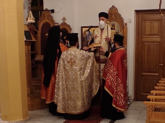 Ο Σεβασμιώτατος χοροστάτησε στον Εσπερινό πλαισιωμένος από τον Πανοσιολ. Αρχιμ. του Οικουμενικού Θρόνου Μελχισεδέκ Αμπελικάκη, τον Πρωτοπρεσβύτερο Σπυρίδων Φουκαράκη, Αναπλ. Γενικό Αρχιερατικό Επίτροπο της καθ΄ημάς Μητροπόλεως, τον Πρεσβύτερο Ιωάννη Καπελλάκη και τον διάκονο Μαρίνο Δασκαλάκη ενώ συμπροσευχόμενοι παρέστησαν εκ του ψαλτηρίου ο Πρωτοπρεσβύτερος Εμμανουήλ Παπακανδεράκης, Αρχιερατ. Επίτροπος της Β’ Αρχιερατ. Περιφέρειας και εκ του ιερού βήματος ο Πανοσιολ. Αρχιμ. Επιφάνιος Ζαχαράκης, εφημέριος της Ενορίας.