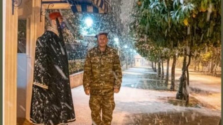Ο Εύζωνας Γιάννης Ιωαννίδης, 24 ετών, από το Αρκαλοχώρι, δεν εγκατέλειψε στιγμή το πόστο του στην κακοκαιρία “Μήδεια” που έπληξε την χώρα μας την προηγούμενη βδομάδα. Στις φωτογραφίες διακρίνεται αριστερά, ο νεαρός Εύζωνας με την κάπα. Φαίνεται, ακόμα, πως η χιονόπτωση είναι έντονη, ωστόσο εκείνος στέκεται αντάξιος της θέσης στην οποία βρίσκεται, αν και η θερμοκρασία είναι εξαιρετικά χαμηλή.