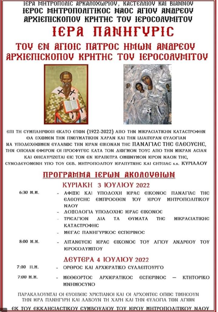 Πρόγραμμα Πανηγύρεως Ιερού Μητροπολιτικού Ναού Αγίου Ανδρέου Αρχιεπισκόπου Κρήτης του Ιεροσολυμίτου. 27 Ιουνίου, 2022 Πατήρ Μιχαήλ Παπαϊωάννου Uncategorized