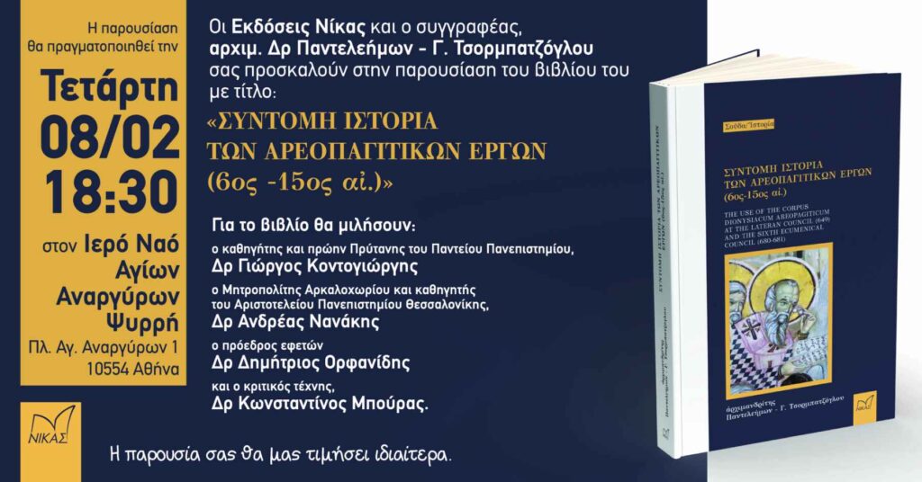 Την Τετάρτη 8 Φεβρουαρίου 2023, πραγματοποιήθηκε με επιτυχία στον Ιερό Ναό Αγίων Αναργύρων Ψυρρή, η παρουσίαση του Βιβλίου με τίτλο “ΣΥΝΤΟΜΗ ΙΣΤΟΡΙΑ ΤΩΝ ΑΡΕΟΠΑΓΙΤΙΚΩΝ ΕΡΓΩΝ (6ος – 15ος αι.)” του Συγγραφέα Αρχιμ. Δρ. Παντελεήμων – Γ. Τσορματζόγλου. Για το Βιβλίο ομίλησαν ο Σεβ. Ποιμενάρχης μας και Καθηγητής του Αριστοτελείου Πανεπιστημίου Α.Π.Θ κ. Ανδρέας Νανάκης, ο Καθηγητής και πρώην Πρύτανης του Παντείου Πανεπιστημίου κ. Γιώργος Κοντογιώργης, ο Πρόεδρος Εφετών κ. Δημήτριος Ορφανίδης και ο κριτικός τέχνης κ. Κωνσταντίνος Μπούρας. Την εκδηλωση παρακολούθησε πλήθος κόσμου.