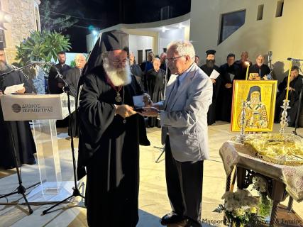 Σε μια όμορφη και συγκινητική εκδήλωση, που πραγματοποιήθηκε το βράδυ της Παρασκευής 15 Σεπτεμβρίου 2023 στoν κατάμεστο από κόσμο αύλειο χώρο του Ιερού Μητροπολιτικού Ναού Αγίου Γεωργίου Ιεράπετρας, απονεμήθηκε στον Σεβ. Μητροπολίτη Ιεραπύτνης και Σητείας κ. Κύριλλο το Παράσημο και το Μετάλλιο του Αγίου Νεκταρίου, τα οποία αποτελούν την ύψιστη τιμητική Διάκριση της Ριζαρείου Εκκλησιαστικής Σχολής, σε ένδειξη τιμής και ευγνωμοσύνης για το λειτουργικό, ποιμαντικό, κατηχητικό, κοινωνικό και φιλανθρωπικό έργο που επιτελεί.