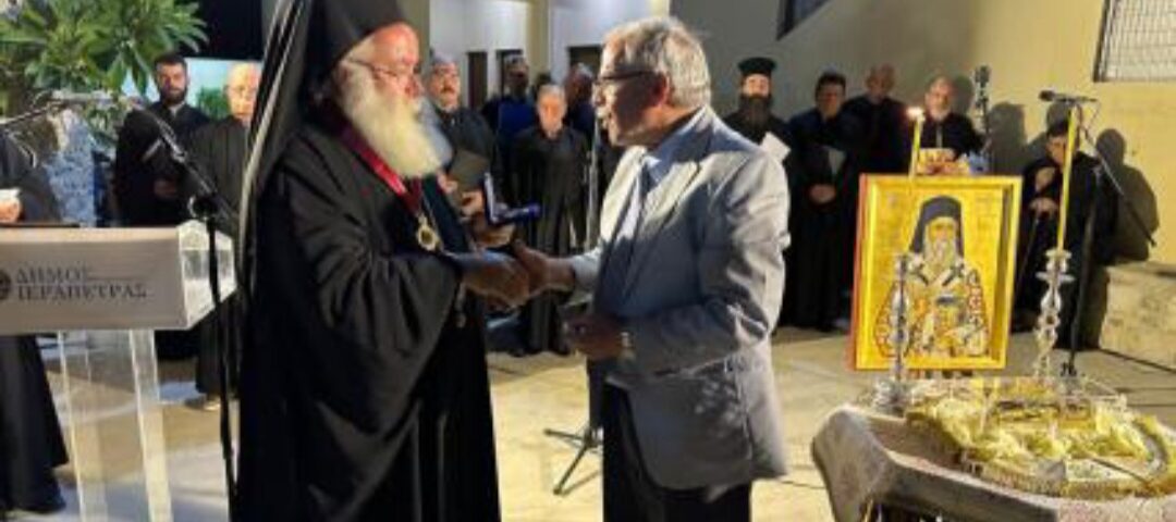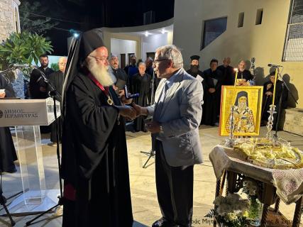 Τον Άγιο που ευλαβείτο ιδιαιτέρως ο μακαριστός Γέροντάς μας Ευγένιος και είχε προστάτη του και βοηθό, κυρίως στις δύσκολες στιγμές της αρχιερατείας του. Και μας άφησε πολύτιμο θησαυρό το παρόν απότμημα από τα άγια λείψανά του, το οποίο του είχε δωρίσει ο μακαριστός Μητροπολίτης Ύδρας κυρός Ιερόθεος σε μια στιγμή δοκιμασίας, όταν χτύπησε σε τροχαίο ατύχημα ο Κληρικός μας, ο π. Ευγένιος. Και αν ζει σήμερα ο Αδελφός μας, τούτο οφείλεται καθαρά στη θαυματουργό χάρη και επέμβαση του αγίου. Και εγώ αξιώθηκα να ζήσω αυτό το ολοζώντανο θαύμα, όπως και άλλο ένα παρόμοιο από τον άγιο. Αυτός είναι και ο λόγος που επιλέξαμε αυτήν τη συμβολική ημέρα να γίνει αυτή η τιμητική εκδήλωση. Και αιτία αυτής της μεγίστης τιμής για μένα τον ανάξιο και ταπεινό Ιεράρχη της Εκκλησίας Κρήτης και του Οικουμενικού Πατριαρχείου είναι ένας Άνθρωπος. Και τονίζω τη λέξη άνθρωπος με το άλφα Κεφαλαίο, διότι στις μέρες μας συναντάς πολλούς ανθρώπους με δεκάδες τίτλους και περγαμηνές, επιστήμονες αφοσιωμένους στην επιστήμη τους, ανθρώπους όμως επιστήμονες με πολλές περγαμηνές και διεθνείς διακρίσεις με σπάνιο ήθος, σεμνότητα, ταπείνωση, καλοσύνη, ευγένεια, αξιοπρέπεια και πηγαία αγάπη συναντάς σπάνια. Και ένας τέτοιος άνθρωπος είναι ο ελλογιμώτατος κ. Χριστόφορος Χαραλαμπάκης, από την ιστορική Ανατολή Ιεράπετρας, με την πλούσια και μακραίωνη παράδοση και τον απαράμιλλο πολιτισμό».