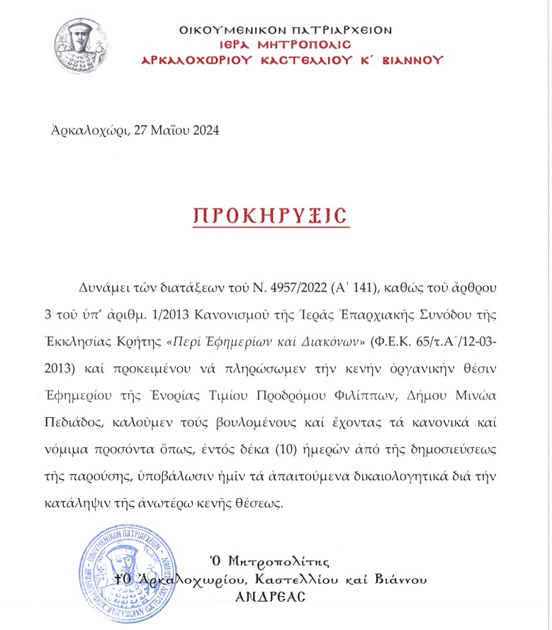 Προκήρυξη κενής οργανικής θέσης εφημερίου στην Ιερά Μητρόπολη Αρκαλοχωρίου, Καστελλίου και Βιάννου