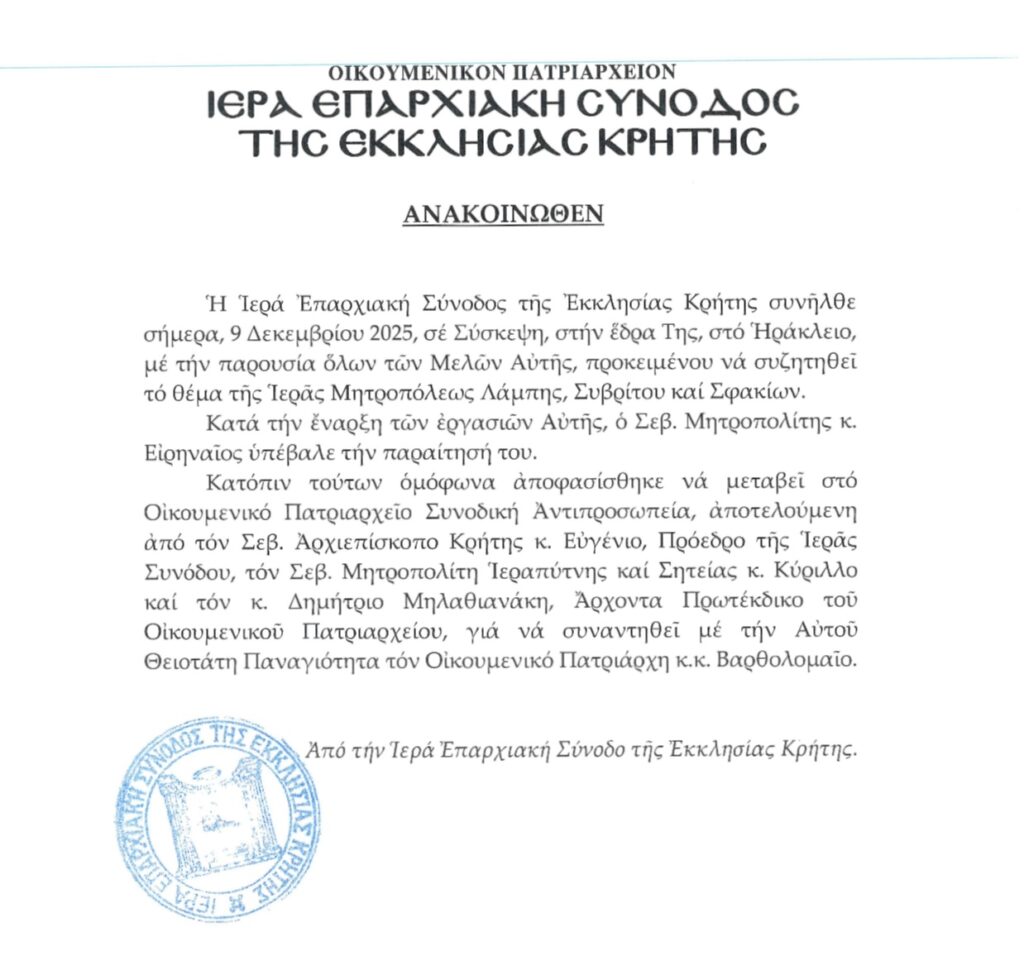 ΑΝΑΚΟΙΝΩΘΕΝ ΙΕΡΑΣ ΕΠΑΡΧΙΑΚΗΣ ΣΥΝΟΔΟΥ ΤΗΣ ΕΚΚΛΗΣΙΑΣ ΚΡΗΤΗΣ 10 Δεκεμβρίου, 2025 Πατήρ Μιχαήλ Παπαϊωάννου Uncategorized